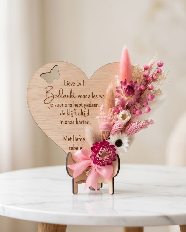 Hartje met boodschap op standaard + droogbloemen